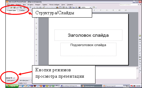 Слайды на экране могут быть представлены в одном из трех режимов: Обычный, Сортировщик слайдов, Показ слайдов. Настройка нужного режима происходит в меню Вид или при помощи кнопок режимов просмотра презентации (рисунок 5.2).