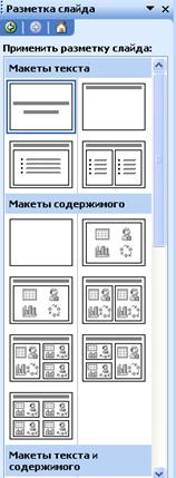 После добавления слайда, он имеет установленную по умолчанию разметку. Изменить ее можно, используя область задач Разметка слайда (рисунок 5.3).