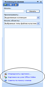 Выбрать меню Вставка – Рисунок – Картинки. Появится область задач Коллекция клипов (рисунок 5.6). Далее надо выбрать подходящую картинку и вставить её стандартным способом.