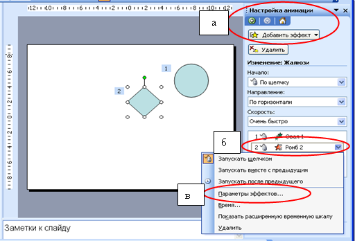 1. Выделить объект в списке анимированных объектов в области задач Настройка анимации. Название выделенного объекта будет обведено рамкой (рисунок 5.8 (б)). Щелчком левой (правой) клавишей мыши раскрыть список и выбрать Параметры эффектов…(рисунок 5.8 (в)).