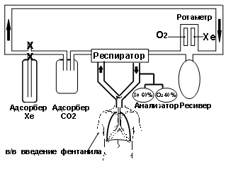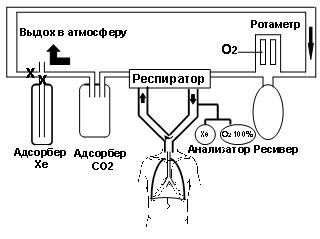 Низкопоточная анестезия проводилась наркозным аппаратом “Drager Fabius” (Германия). Хе подавался через ксеноновую наркозную приставку (КНП-01) по воздушному каналу. Концентрации FiO2 и FiХе определялись с помощью газоанализатора бинарных смесей ГКМП-02-Инсовт, установленного на канале вдоха.