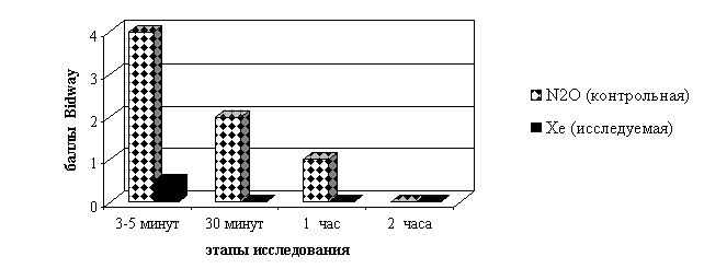 2. Оценка течения раннего послеоперационного периода проводилась по изучению времени восстановления психических функций (тест Bidway), самостоятельного дыхания, а также по показателям функционального состояния центральной гемодинамики в ближайшем послеоперационном периоде.