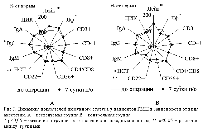 3. Оценка состояния системы иммунитета проводилась по изучению показателей основных субпопуляций лимфоцитов в периферической крови, иммуноглобулинов трех типов A, M, G и функциональной активности нейтрофилов (НСТ-тест).