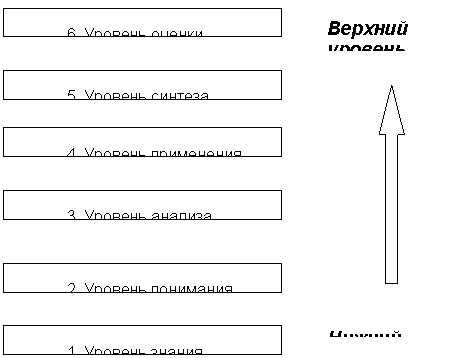 Каждая из областей, в свою очередь, разделяется на подобласти. Наиболее разработана и часто используется классификация целей в рамках познавательной области, Она представляет собой иерархическую шестиуровневую структуру. Работа по достижению целей более высокого уровня базируется на достигнутых целях более низких уровней.