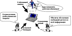 Рассмотрим, используя метафоры, три подхода к применению компьютеров в обучении, которые широко применяются сегодня (см. рис. 1). Речь идет о компьютере как хранилище (и источнике) информации, о компьютере как развивающей среде, о компьютере как обучающем устройстве.
