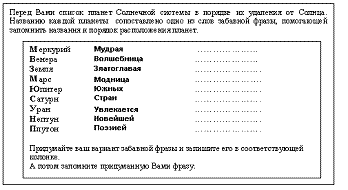 Излагая факты, их можно не только сообщить (с помощью текста, аудио или видео), но и закрепить (связать) с помощью мнемонических приемов. На рис. 4.8. приведен пример изложения материала о взаимном расположении планет солнечной системы.