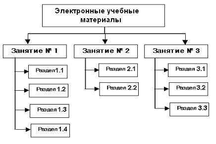 Разбиение электронного учебного материала на отдельные части — уроки и разделы — задает организационную структуру материала. Эта структура выбирается с учетом требований организационных (например, допустимое количество и продолжительность занятий) и технологических (желательно разместить материалы на одном томе носителя информации). Отвечая тем или иным специфическим ограничениям, организационная структура всегда подчинена учебной структуре.