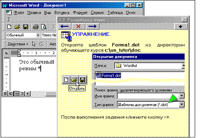 Иногда можно найти промежуточное решения. Оно наиболее естественно при обучении работе с компьютерными программами. Технически возможно организовать практическую работу с изучаемым программным средством, непосредственно из электронных учебных материалов. На рис. 9 показан пример выполнения упражнения в среде MS Word под управлением созданной УНИАР обучающей программы "Word 7.0. Путь наверх". Задание можно прочесть в окне обучающей программы (оно сверху). В этом же окне приведены дополнительные указания по выполнению задания. Учащися может свернуть, развернуть или переместить каждое из окон, пользуясь средствами Windows. Практическая работа (упражнение) выполняется в окне редактора MS Word. После завершения упражнения работа с электронным учебным материалом продолжается (окно обучающей программы автоматически развертывается на весь экран).