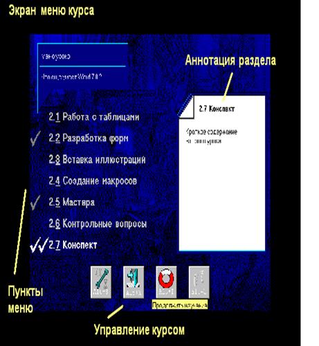 Рис. 10. Перед вами пример типового меню. Обратите внимание на расположение пунктов меню, напоминающее оглавление в книге, и аннотации текущего раздела курса (справа). Раздел "Мастера" помечен галочкой (обучаемый проработал его частично). Раздел "Конспект" помечен двумя галочками (обучаемый просмотрел его полностью).