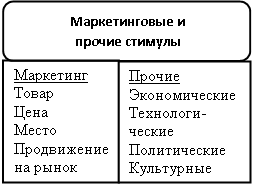 Основной вопрос маркетинга – «Как реагируют покупатели на различные маркетинговые приемы компании?». Исходный пункт – модель покупательского поведения «побуждение – реакция», показанная на рисунке 10. На рисунке видно, как маркетинговые и другие приемы проникают в «черный ящик» (подсознание) потребителя и порождают определенную реакцию. Задача маркетологов – выяснить, что скрывается в этом «черном ящике». Маркетинговые стимулы представлены четырьмя элементами Р, к прочим стимулам относятся факторы окружающей покупателя среды: экономической, технологической, политической и культурной. Все эти составляющие попадают в «черный ящик» потребителя и превращаются в совокупность реакций: выбор товара, торговой марки, торгового посредника, времени и объема покупки.