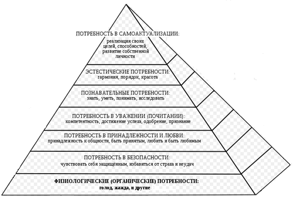Абрахам Маслоу попытался объяснить, почему в разное время у людей возникают разные потребности. Согласно теории А. Маслоу существует пирамида человеческих потребностей. В этой пирамиде человеческие потребности расположены в порядке иерархической значимости (рисунок 12). В первую очередь человек стремится удовлетворить физиологические потребности. Как только ему это удается, появляется побуждение к удовлетворению следующего уровня потребностей, и т. д.