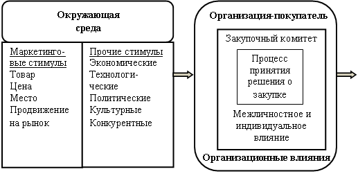 Внутри компании деятельность по закупке подразделяется на две важные составляющие — закупочный комитет, в состав которого входят все лица, участвующие в принятии решения о покупке, и процесс принятия решения о покупке. Данная модель показывает, что на закупочный комитет и процесс принятия решения влияют факторы не только внешней рыночной среды, но и внутренней среды компании: организационная структура, межличностные отношения и индивидуальные особенности сотрудников.