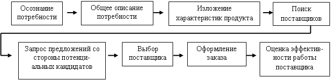 На рисунке 17 схематично изображены этапы процесса осуществления закупок. При новой закупке процесс, как правило, состоит из восьми этапов, при обычной или измененной повторной закупке некоторые этапы можно миновать.