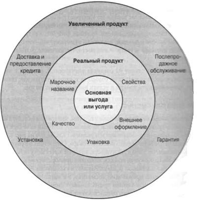 Следовательно, товар превращается в нечто большее, чем простой набор материальных характеристик. Потребители склонны рассматривать товары как сложный набор выгод, который удовлетворяет их потребности. При разработке товара маркетологи, в первую очередь, должны определить основные потребности, которые будет удовлетворять товар, затем разработать товар в реальном исполнении и, наконец, найти способы его подкрепления, чтобы создать тот набор выгод, который наиболее полно удовлетворит потребителя.