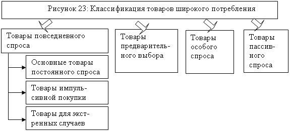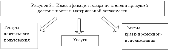 При выборе стратегий маркетинга для отдельных товаров на рынке приходится разрабатывать ряд товарных классификаций на основе присущих этим товарам характеристик. Виды классификаций товара представлены на рисунках 21, 22, 23.