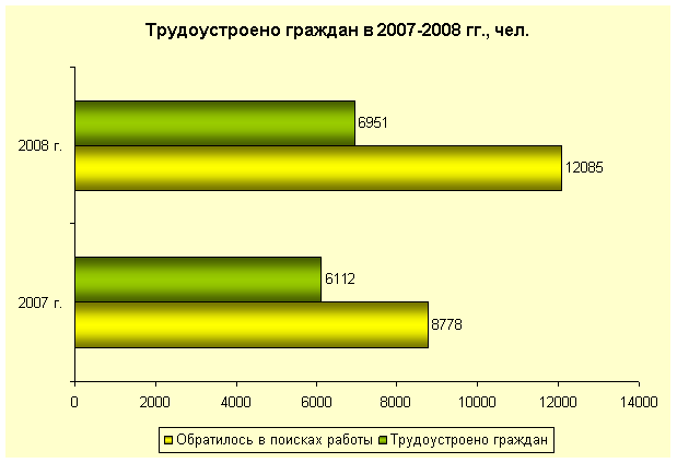 В 2008 году в ГУ «Центр занятости населения Старого Оскола» по вопросу поиска подходящей работы обратилось 12 085 чел. (на 38% больше, чем в 2007 году). Трудоустроено при содействии Центра занятости 6951 чел. (58% от обратившихся граждан и на 14% больше, чем в 2007 году) (Приложение 2). Но процент трудоустройства в 2008 году снизился по сравнению с 2007 годом с 69,6% до 57,5%. Это связано с сокращением численности работников предприятий и с резким сокращением или полным отсутствием вакантных мест на предприятиях города в условиях мирового экономического кризиса.
