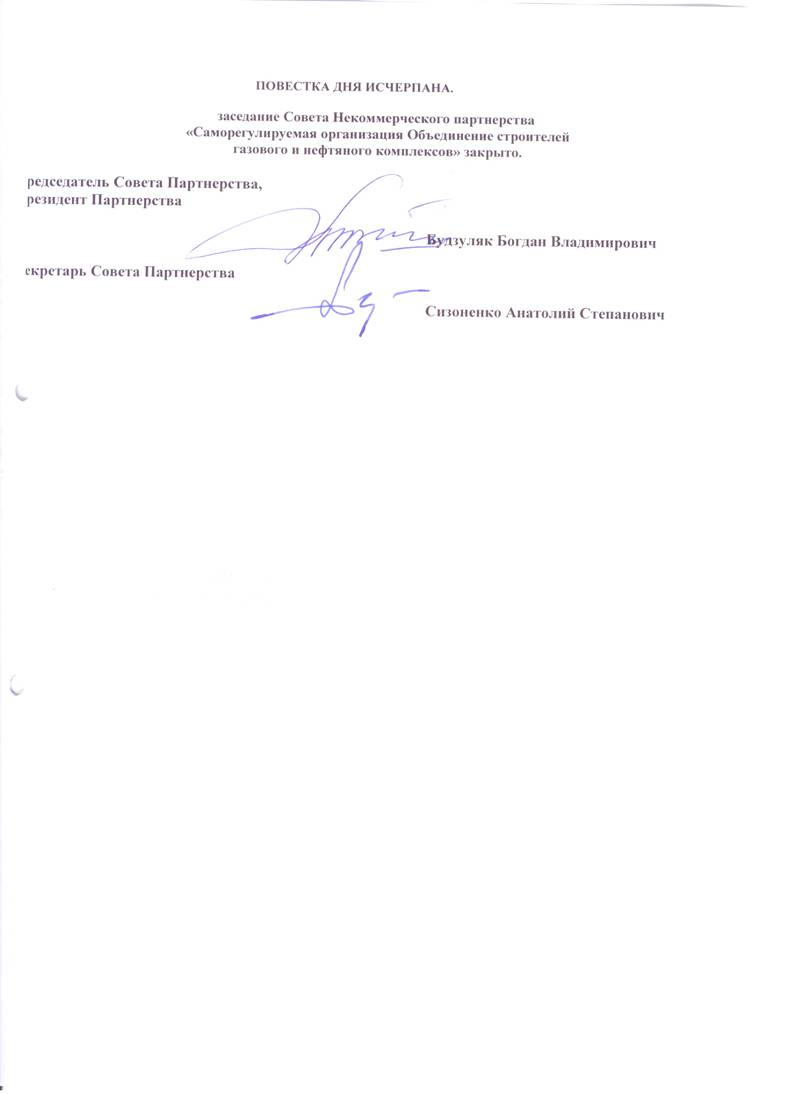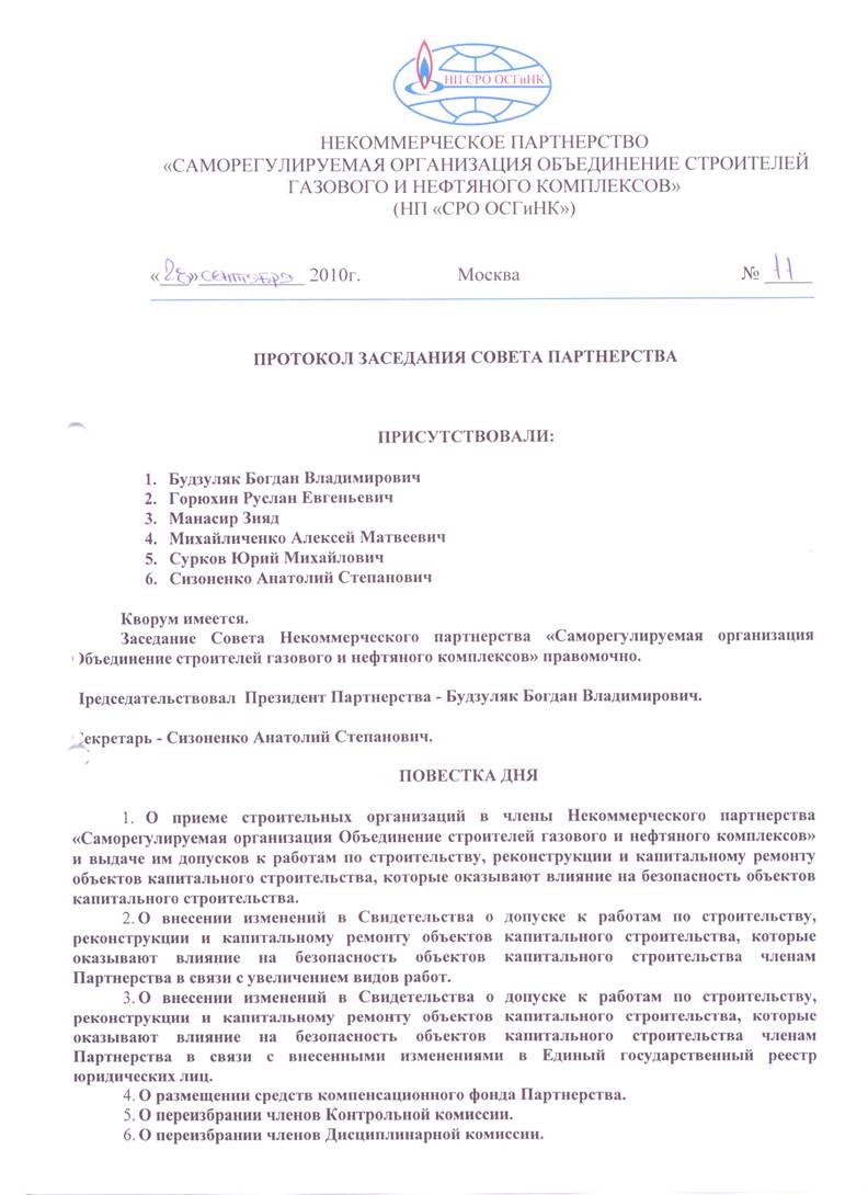 Заявления и прилагаемые документы рассмотрены Контрольной комиссией, дано заключение о соответствии вышеперечисленных строительных организаций Требованиям Некоммерческого партнерства "Саморегулируемая организация Объединение строителей газового и нефтяного комплексов", согласно заявленным ими видам работ (Протокол Контрольной комиссии №12 от 01.01.2001 года).