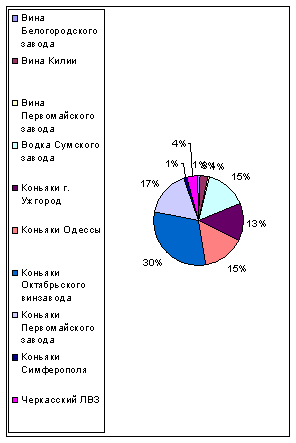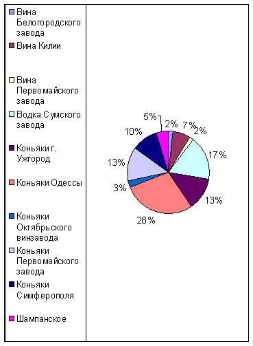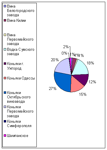Итак, подведем итоги деятельности ООО «Максим» за первые три четверти 2002 года. Наболее выгодной в первой четверти 2002 года стала закупка и продажа коньяков Октябрьского винзавода, составивишие 30% прибыли предприятия «Максим». Вторыми по продаваемости стали коньяки Первомайского завода (17%). Третье место поделили коньяки Одессы и водка Сумского завода (15%). Наименьшим спросом пользовались вина Первомайского завода, коньяки Симферополя и вина Белогородского завода.