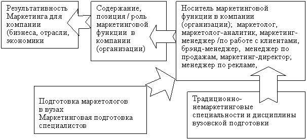 Результативность маркетинга и проблема роли маркетинга в компании - это, в частности, и проблема подготовки маркетологов (рис.1) . Это ответ на вопросы – кто, что, когда, как, почему, где должен обучать специалистов-маркетологов. Российская практика так или иначе нащупывает эти решения опытным путем. И на этот путь стоит обратить внимание.