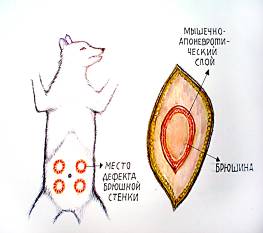 Рис. 2. Схема экспериментальной модели дефекта брюшной стенки и пластики дефекта имплантатом.