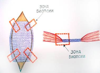 Биопсия выполнялась под общим обезболиванием в условиях операционной с соблюдением необходимых требований асептики и антисептики. По ходу биопсии оценивались макроскопическое расположение имплантата, состояние тканей в зоне имплантации, наличие скопления тканевой жидкости, характер роста соединительной ткани, формирование грануляционной капсулы, прорастание вновь образованной соединительной ткани, ее связь с имплантатом и тканями, окружающими имплантат. Дефекты в зоне имплантации восстанавливались с помощью одноименного шовного материала с ушиванием операционной раны наглухо.