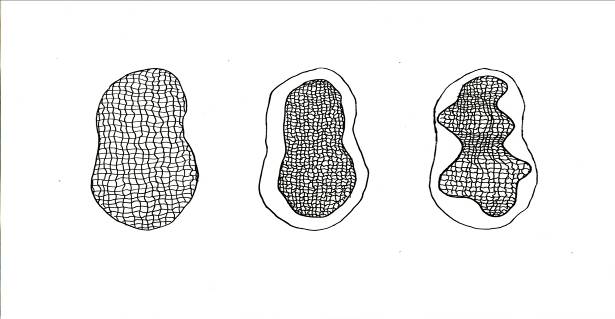 По схеме моделирования дефекта (рис.2) разрезом в одной из обозначенных для имплантации областей брюшной стенки выполнялись разрезы для доступа к мышечно-апоневротическому слою. Затем иссекались ткани мышечно-апоневротического слоя до брюшины с формированием дефекта размером около 5 Х 5 см. В дефект мышечно-апоневротического слоя вшивался подобранный по размеру дефекта имплантат с фиксацией одноименным шовным материалом с дистанцией между швами около 1см. По отношению к мышечно – апоневротическому слою имплантат располагался предбрюшинно (sublay). Кожа с подкожной клетчаткой ушивалась над дефектом и имплантатом наглухо без дренирования.