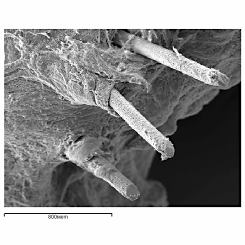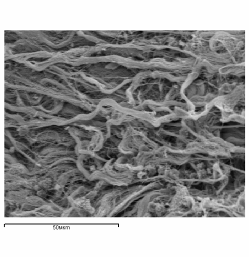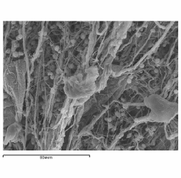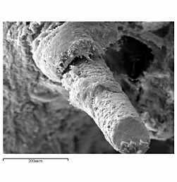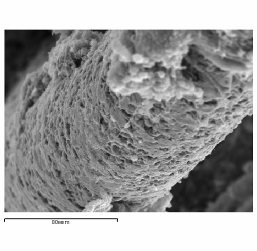 Наблюдается прочная фиксация фибробластов и коллагеновых волокон к отдельным элементам имплантата. Промежутки между коллагеновыми волокнами незначительны, что характерно для плотной соединительной ткани. Отмечается упорядоченное фибриллярное строение цилиндрических коллагеновых волокон Мощные пучки коллагеновых волокон ориентированы циркулярно по отношению к отдельным нитям имплантата. Коллагеновые волокна, образующие пучки, спиралевидно изогнуты, что придает соединительной ткани дополнительную прочность. Поверхностный складчатый рельеф волокон образован коллагеновыми фибриллами, входящими в состав волокон и расположенными вдоль их длинной оси. Специфическая конформация спиральных коллагеновых волокон поддерживается специальной системой тонких коллагеновых волоконец, оплетающих циркулярно нити имплантата и вплетенных в более толстые коллагеновые волокна, расположенные между ними. Особенности микрорельефа поверхности имплантата способствуют распространению по его поверхности на значительные расстояния клеточных и волокнистых элементов новообразованной соединительной ткани, что обеспечивает их надежную фиксацию в регенерате (рис. 6).