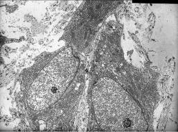 г - дифференцированные зрелые фибробласты, в перицеллюлярном и межклеточном пространстве многочисленные формирующиеся коллагеновые волокна, ЭГ, ув. 7000.