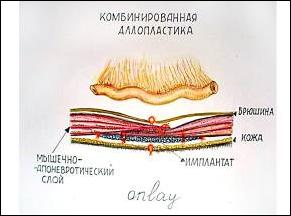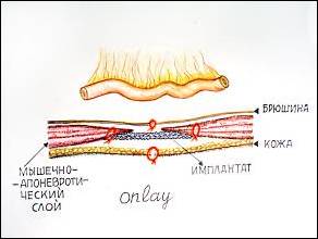 1. Onlay – расположение и фиксация имплантата на наружной (передней) поверхности мышечно-апоневротического слоя и дефекта в нем.