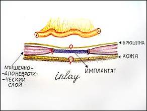 2. Inlay – расположение имплантата в виде вставки в дефект брюшной стенки.