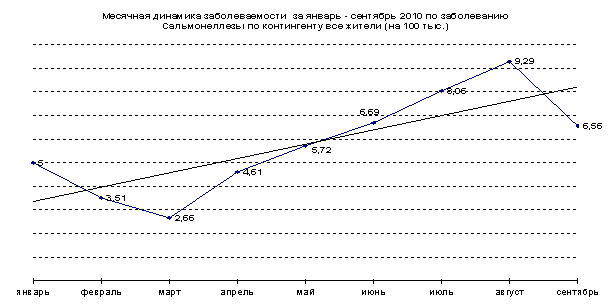 За 9 месяцев 2010 года зарегистрировано 802 случаев сальмонеллеза (52,1 на 100 тыс.). Снижение относительно того же периода прошлого года на 14,96%. Неблагополучные территории – г. г. Сургут (96,3 на 100 тыс. нас.) – превышение окружного показателя на 84,8%, Югорск (69,2 на 100 тыс.), Радужный (66,9 на 100 тыс. нас.), Сургутский район (65,8 на 100 тыс. населения).