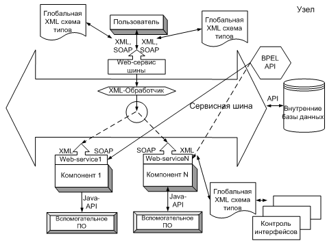 На рисунке 5 показаны основные составляющие и схема взаимодействия компонент внутри узла на основе методов и средств сервисной шины.