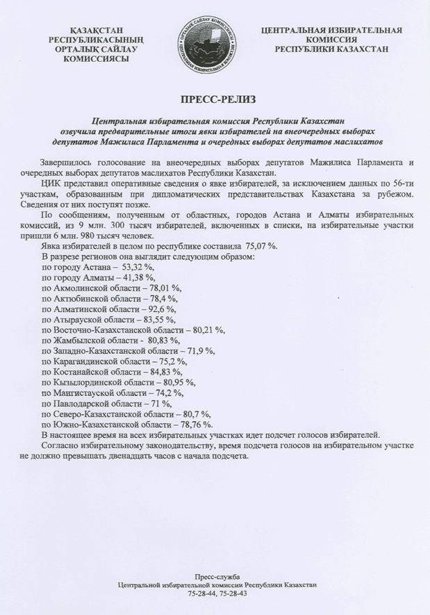 2. Пресс-релиз ЦИК Казахстана по итогам явки избирателей
