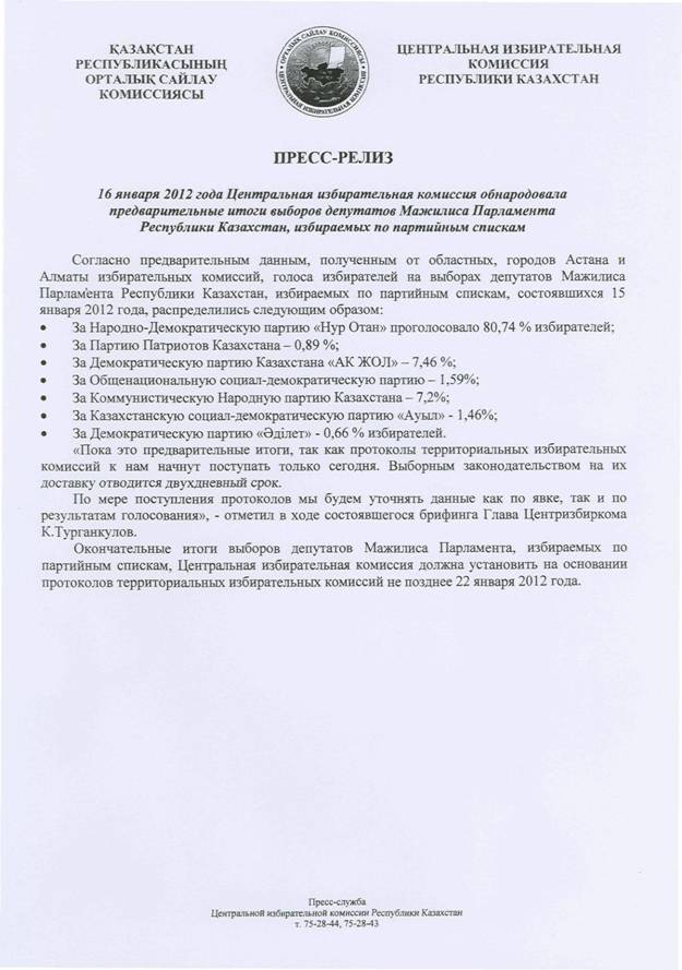 3. Пресс-релиз ЦИК Казахстана по предварительным итогам выборов