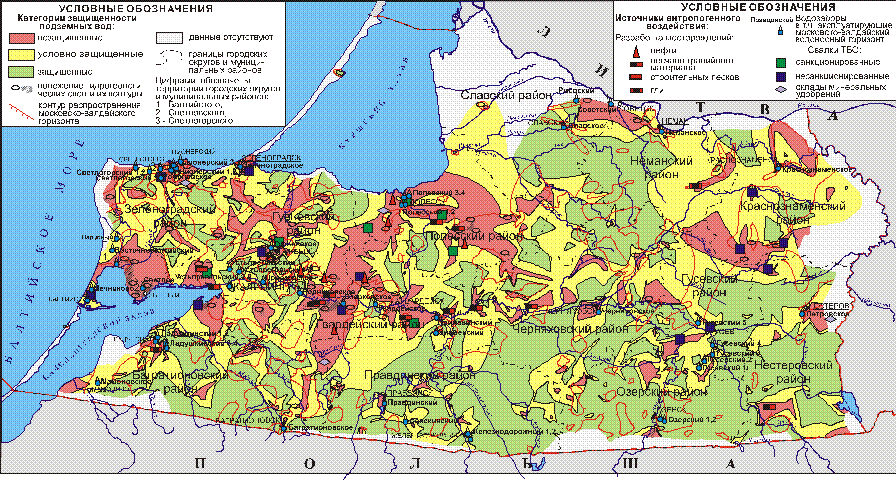 На водозаборах, расположенных вблизи указанных населенных пунктов, риск загрязнения возрастает. Наибольшую опасность представляют участки площадью около 60 км2 (0,64% площади распространения водоносного горизонта) со сроком проникновения загрязняющих веществ до 5 лет: гг. Светлый, Светлогорск, Черняховск, пос. Приморск, Прибрежный, Нивенское, Переславское, Озерки.