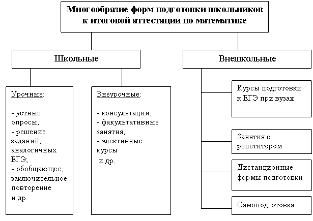 Показано, что используемые на практике формы подготовки школьников к ЕГЭ по математике можно подразделить на: школьные (урочные и внеурочные) и внешкольные (курсы при вузах, занятия с репетитором, дистанционное обучение, самоподготовка и др.) (схема 1).