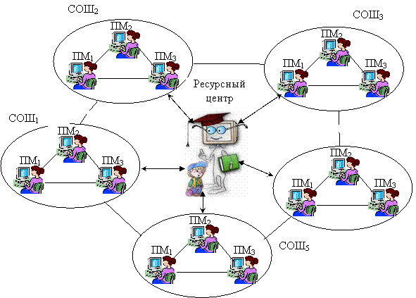 Виртуальный класс для сельских школьников понимается нами, как особое учебное образование, связывающее посредством информационно-коммуникационных технологий учащихся различных сельских школ, объединенных общностью образовательных целей и задач друг с другом, а также с некоторым ресурсным центром (тьютором), обладающим всеми необходимыми педагогическими и технологическими ресурсами для достижения детьми поставленных целей (схема 2).
