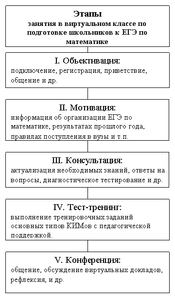 4. Определены основные структурные компоненты занятия по подготовке школьников к ЕГЭ по математике в виртуальном классе: объективизация, мотивация, консультация, тест-тренинг и конференция. Общая структура занятия в виртуальном классе определяется последовательностью этих этапов; она пригодна для занятий по выполнению заданий всех трех частей экзаменационной работы по математике.