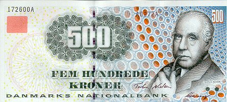 Нильс Бор () изображен на купюре в 500 крон, Дания. Бор был один из главных архитекторов квантовой теории. Он создал первую квантовую модель атома и играл главную роль в развитии современной интерпретации квантовой теории.