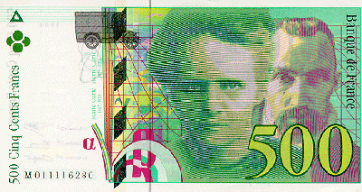 Пьер и Мария Кюри - купюра в 500 франков, Франция, 1994. Единственная в мире банкнота с изображением двух ученых физиков сразу.