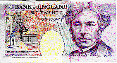 Английская валюта 1993 года - купюра в 20 фунтов. Изображен Майкл Фарадей.
