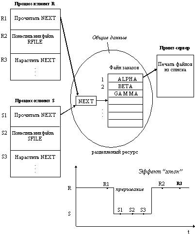 Рассмотрим, например (рисунок 2.3), программу печати файлов (принт-сервер). Эта программа печатает по очереди все файлы, имена которых последовательно в порядке поступления записывают в специальный общедоступный файл "заказов" другие программы. Особая переменная NEXT, также доступная всем процессам-клиентам, содержит номер первой свободной для записи имени файла позиции файла "заказов". Процессы-клиенты читают эту переменную, записывают в соответствующую позицию файла "заказов" имя своего файла и наращивают значение NEXT на единицу. Предположим, что в некоторый момент процесс R решил распечатать свой файл, для этого он прочитал значение переменной NEXT, значение которой для определенности предположим равным 4. Процесс запомнил это значение, но поместить имя файла не успел, так как его выполнение было прервано (например, в следствие исчерпания кванта). Очередной процесс S, желающий распечатать файл, прочитал то же самое значение переменной NEXT, поместил в четвертую позицию имя своего файла и нарастил значение переменной на единицу. Когда в очередной раз управление будет передано процессу R, то он, продолжая свое выполнение, в полном соответствии со значением текущей свободной позиции, полученным во время предыдущей итерации, запишет имя файла также в позицию 4, поверх имени файла процесса S.