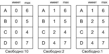 Рассмотрим систему: банкир может дать 10 кредитов (ресурсы), к нему попеременно обращаются четыре клиента.