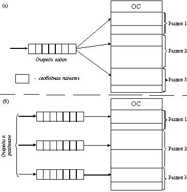 Рис. 2.9. Распределение памяти фиксированными разделами: а - с общей очередью; б - с отдельными очередями