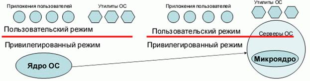 Микроядерная архитектура является альтернативой классическому способу построения ОС. Под классической архитектурой понимается рассмотренная выше структурная организация ОС, в соответствии с которой все основные функции ОС, составляющие многослойное ядро, выполняются в привилегированном режиме. При этом некоторые вспомогательные функции ОС оформляются в виде приложений, выполняющихся в пользовательском режиме. Каждое приложение пользовательского режима работает в собственном адресном пространстве и защищено от вмешательства. Код ядра имеет доступ ко всей памяти, но сам полностью защищен. Приложения обращаются к ядру с запросами на выполнение системных функций.