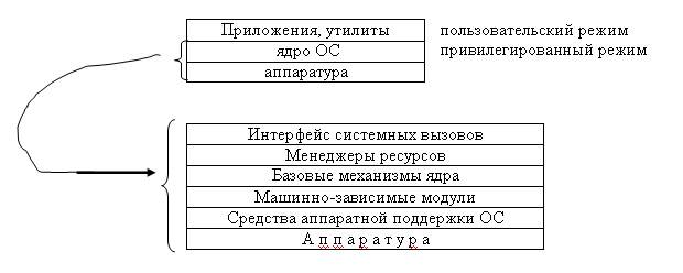 Вычислительную систему, работающую под управлением ОС на основе ядра, можно рассматривать как систему, из трех иерархически расположенных слоев: нижний слой образует аппаратура, промежуточный - ядро, а утилиты составляют верхний слой.