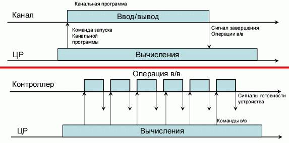 Если посмотреть на совмещение во времени операций в/в и вычислений, то можно представить себе несколько различных способов. Один их них характерен для систем с выделенным процессором в/в. В мэйнфреймах процессоры ввода-вывода называются каналами. Обычно канал имеет систему команд, отличающуюся от системы команд центрального процессора. Эти команды специально предназначены для управления внешними устройствами. Канальные программы могут храниться в той же оперативной памяти, что и программы центрального процессора. В системе команд центрального процессора предусмотрена специальная инструкция, с помощью которой каналу передаются параметры и указания на то, какую программу ввода-вывода он должен выполнить. Начиная с этого момента центральный процессор и канал могут работать параллельно.