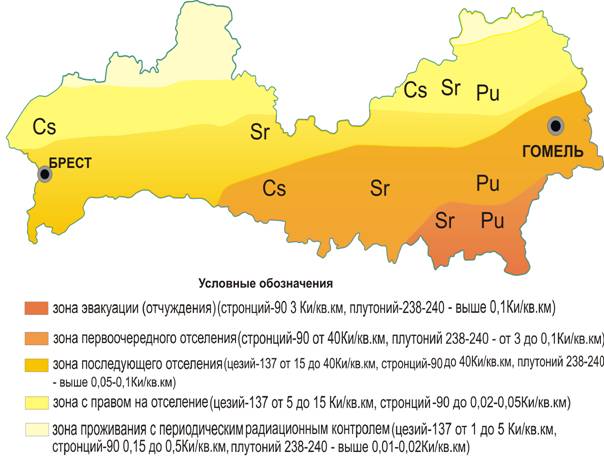 Рис. 3. Территории радиоактивного загрязнения почв Белорусского Полесья