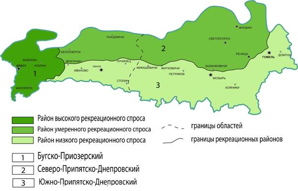 В результате на территории Белорусского Полесья выделено 3 рекреационных района (рисунок 5). Бугско-Приозёрский район отнесён к типу районов высокого рекреационного спроса, Северо-Припятско-Днепровский – умеренного рекреационного спроса, Южно-Припятско-Днепровский – невысокого рекреационного спроса. Каждый рекреационный район имеет определённый набор туристических ресурсов для развития экологического, познавательного, водного, охотно-рыболовного и других видов туризма.