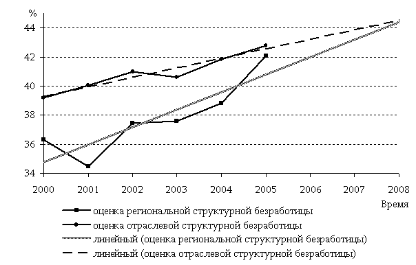 Рис. 1. Отраслевая и региональная структурная безработица, предполагаемый тренд ее изменения